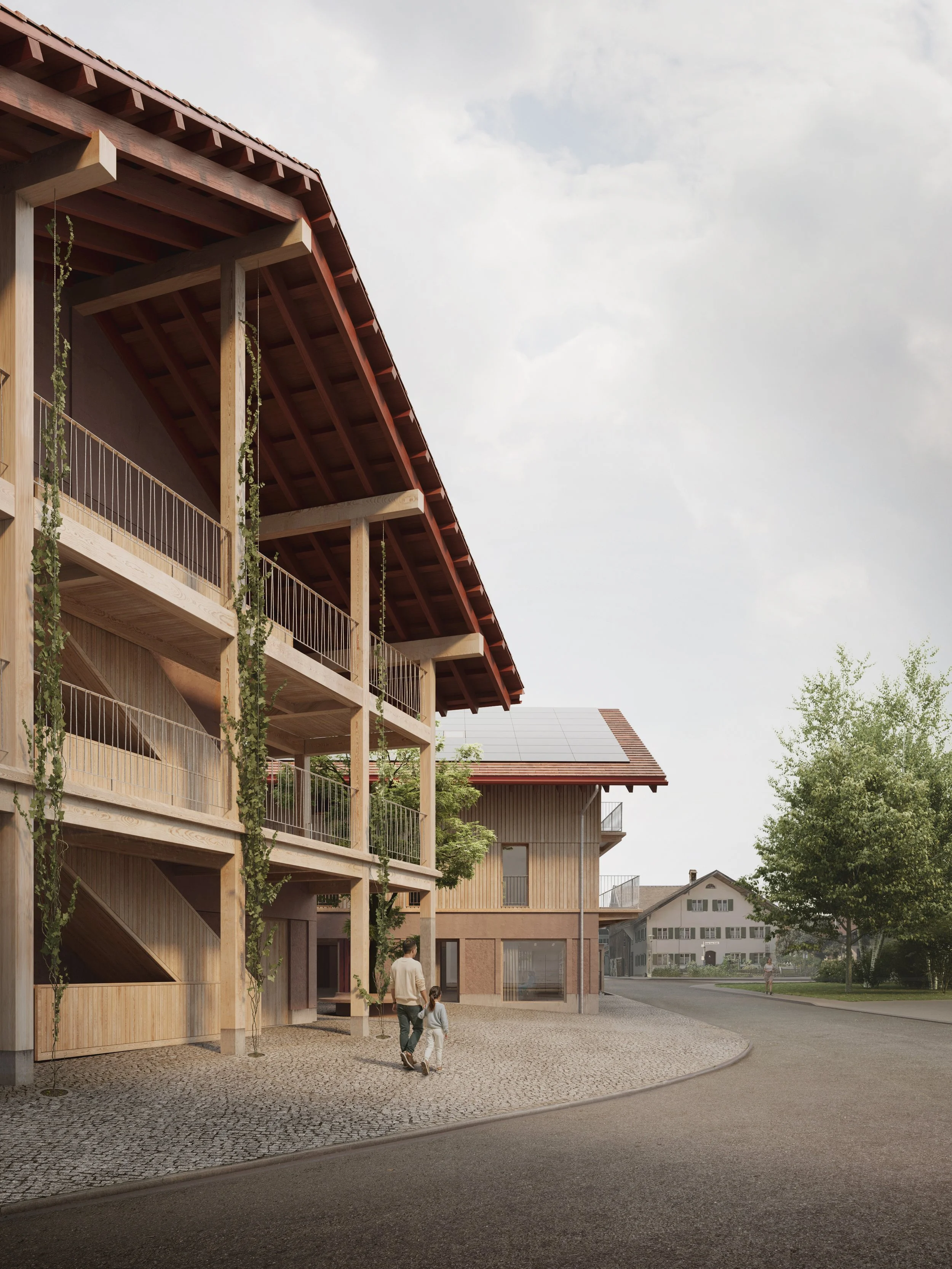 Stretching from the town church to agricultural fields, the proposal respects the local architectural vernacular characterised by two long buildings recalling the traditional farmhouses of Rosshaupten which feature deep plots, street-facing gables and semi-public yards. The two proposed buildings will frame a sequence of public spaces, starting with a civic square defined by the relationship between the church and the gable of the long building; and moving inward, a courtyard space which provides access to the community hall, clinic, and residential apartments, leading to an expansive garden that serves as a semi- private space including gardens at the rear designed for people with Dementia Reflecting the tradition of timber architecture in the town, EC-SH’s structures embrace humble materials familiar to the community, adapted for contemporary use and with environmental considerations in mind. The buildings will feature exposed timber frames and timber upper floors, sitting on a masonry ground level finished in warm coloured render, and large roofs with red tiles and beams. The boarded facades with balconies and shutters add depth and variation. The thermal envelope is separated from the frame on the upper floors, making unconditioned, shared spaces of wide decks, stairs and the winter garden where residents can enjoy sweeping views of the town, countryside and a horizon of mountains.